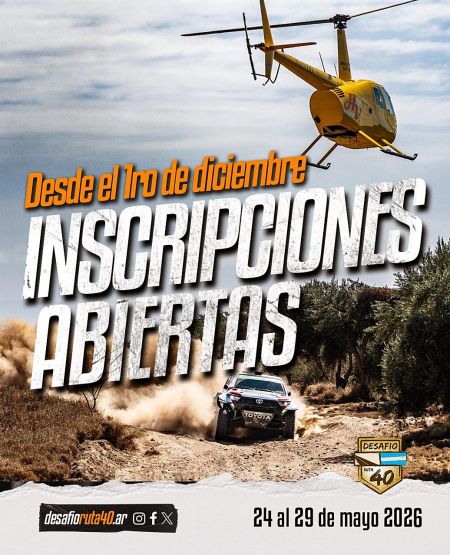 El Desafío Ruta 40 abre oficialmente sus inscripciones para su 13° edición, que se disputará del 24 al 29 de mayo de 2026. La competencia más emblemática del rally raid en Sudamérica vuelve a convocar a pilotos de todo el mundo para vivir una experiencia deportiva única, marcada por la exigencia, la aventura y la pasión por el off-road como solo sucede en Argentina. Informes: info@maseventos.com.ar